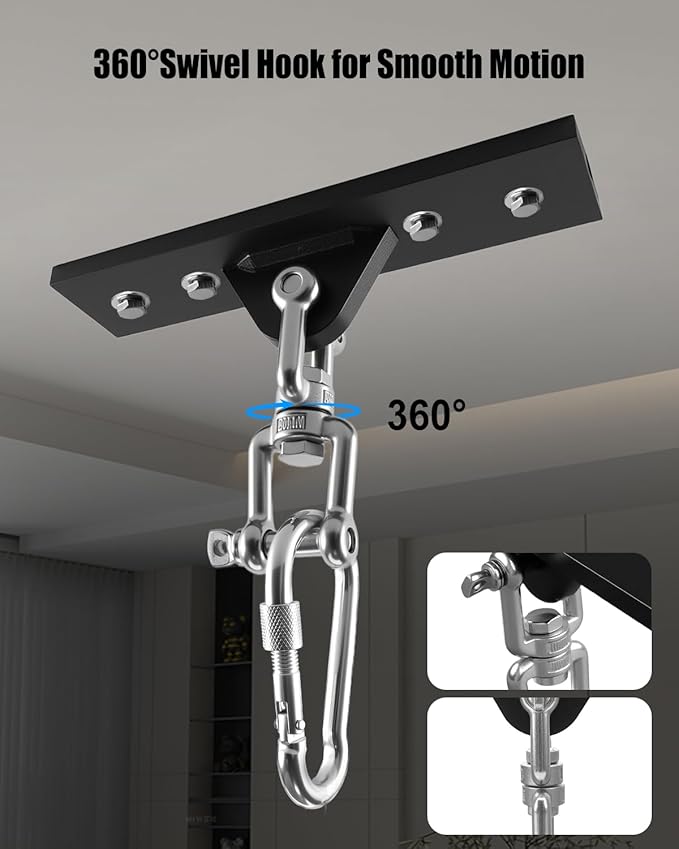 - 360° Swivel Hook: Equipped with a 360-degree swivel, the mount allows your bag, swing, or hammock to rotate freely without twisting the straps. Enjoy fluid movement—without friction or interruption