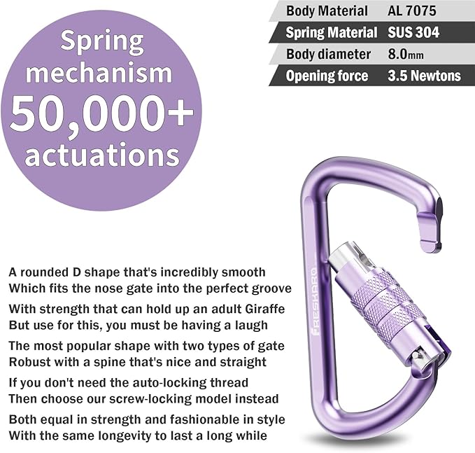 - 【SAFE TO USE】- With the auto lock, you don’t need to worry you would lose your keys or belonging; it’s a very strong carabiner (12kN/2698lbs), and you don’t need to worry about hanging a heavy hammock chair or other heavy stuff