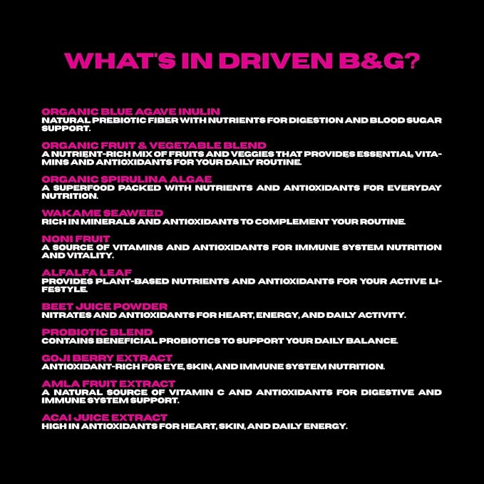 - Pure & Organic Ingredients: When it comes to superfoods, quality matters. In formulating B&G, we used 100% organic berry superfoods, vegetables, and sea greens. To increase the deliciousness of each drink, we skipped the harsh artificial sweeteners that tend to produce gut issues, and we opted f