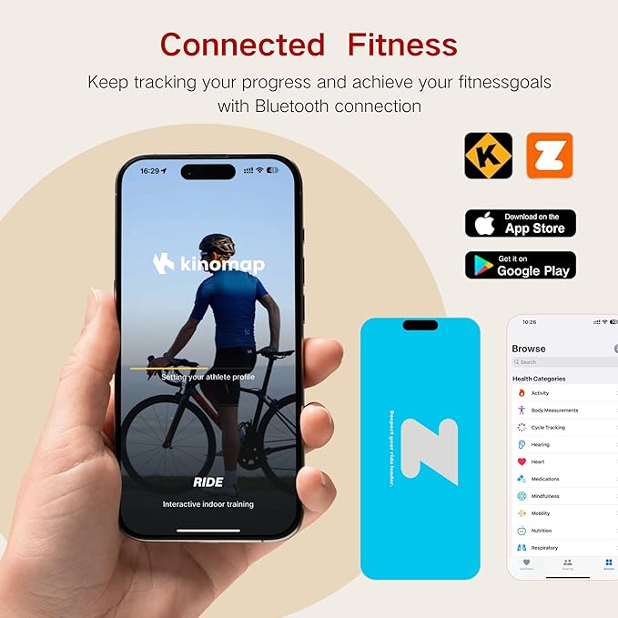 - 【2025 EXERCISE BIKE WITH BLUETOOTH & FITNESS APP】 A stationary connected via Bluetooth, paired with Kinomap or Zwift software, brings a new experience to your home fitness. The software provides diverse cycling scenarios, records training data, and elevate your training to the next level.